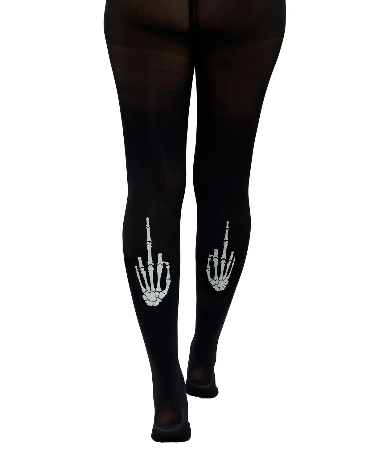 Really send a message with these 50 denier tights with skeleton middle finger transfer!